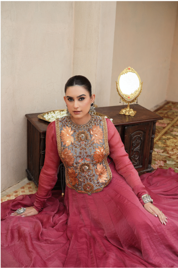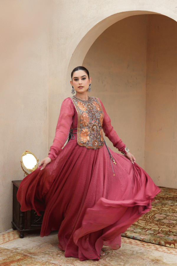Embrace the romantic allure of vintage India with the “Zoya” This kalidaar suit exudes an old-world charm, featuring a gracefully flowing skirt in a beautiful muted rose tissue fabric. The intricately embellished bodice is a tribute to traditional Indian embroidery, showcasing a rich tapestry of motifs in antique gold, bronze, and subtle earthy tones. Its classic design and timeless elegance make it a perfect choice for those who appreciate heritage fashion and desire a sophisticated, understated look for special occasions. Accessorize with heirloom jewelry to enhance its vintage appeal.