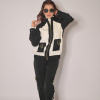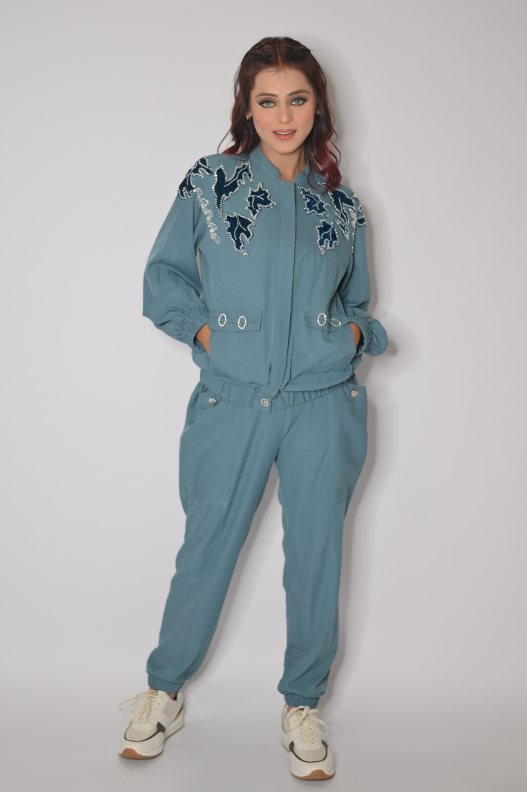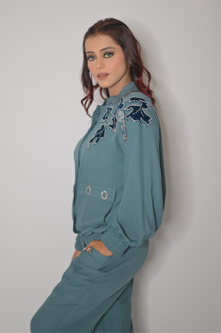 Embroidered bomber jacket with pockets and buckle details.