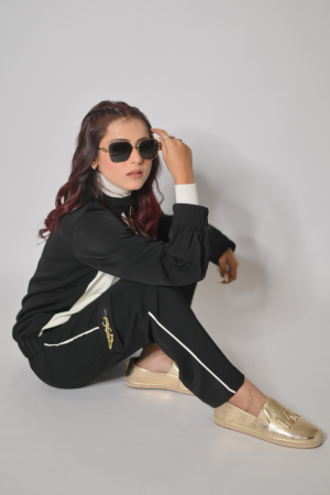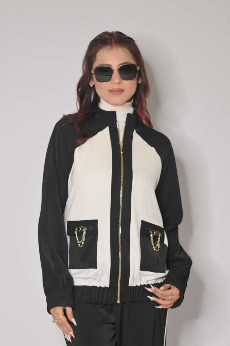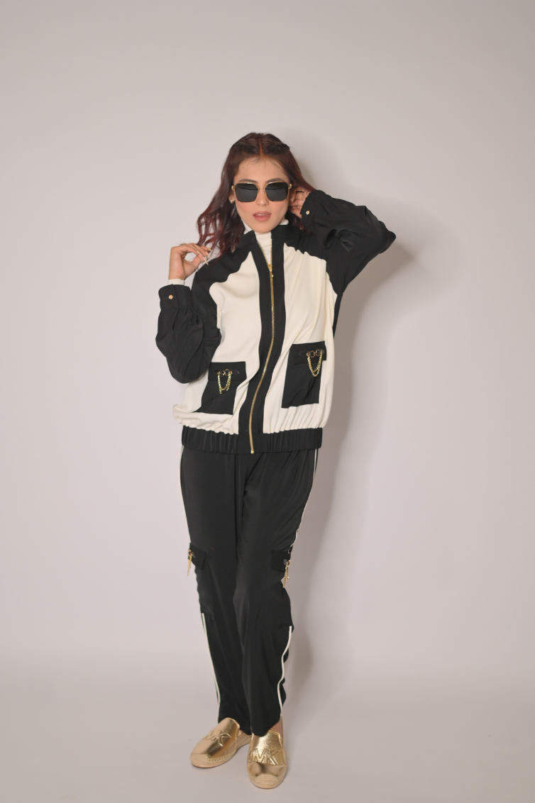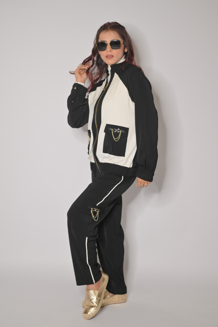 Colour block bomber jacket with zipper and chained buckle details. Trousers with side piping and pockets. Option available to shop only the jacket. –Click Here