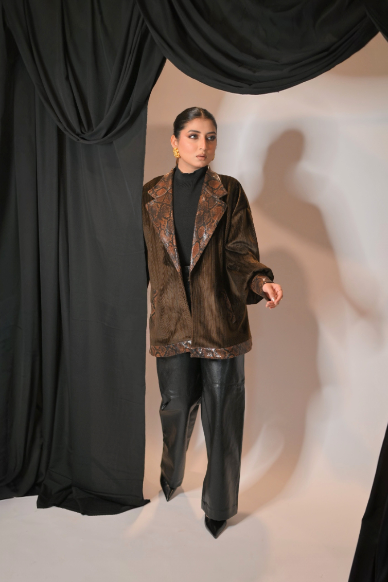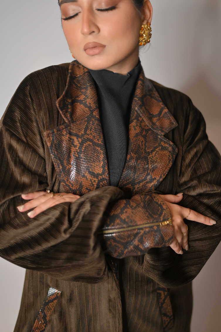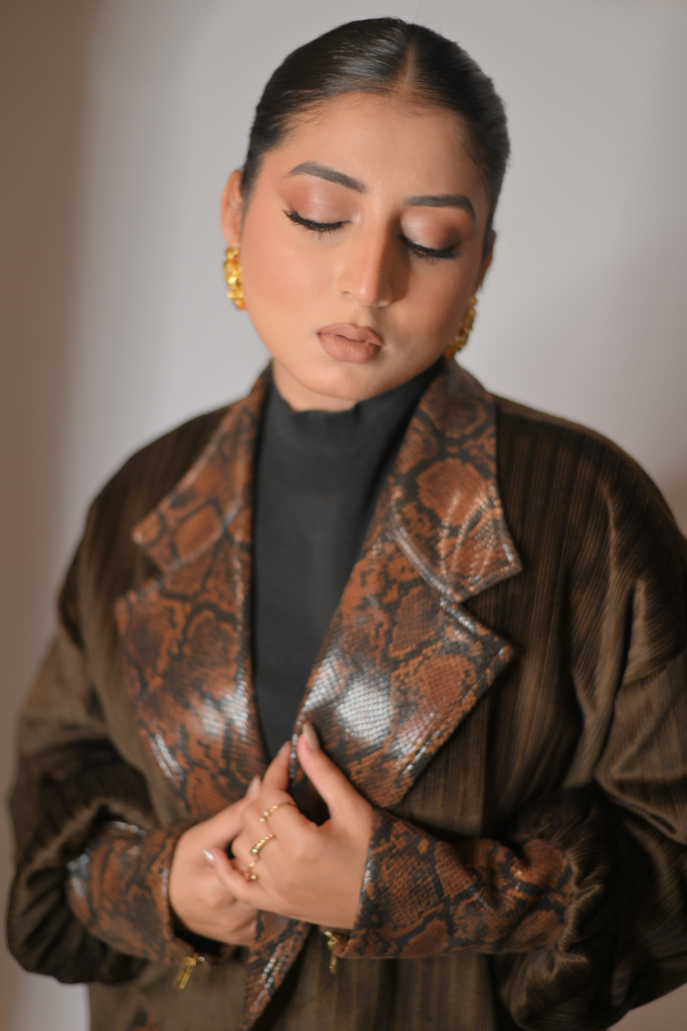 This jacket is an absolute showstopper. It features a gorgeous pleated fabric that catches the light, giving off a deep bronze shimmer. The massive faux snake leather lapels add that perfect vintage grit and glamour.