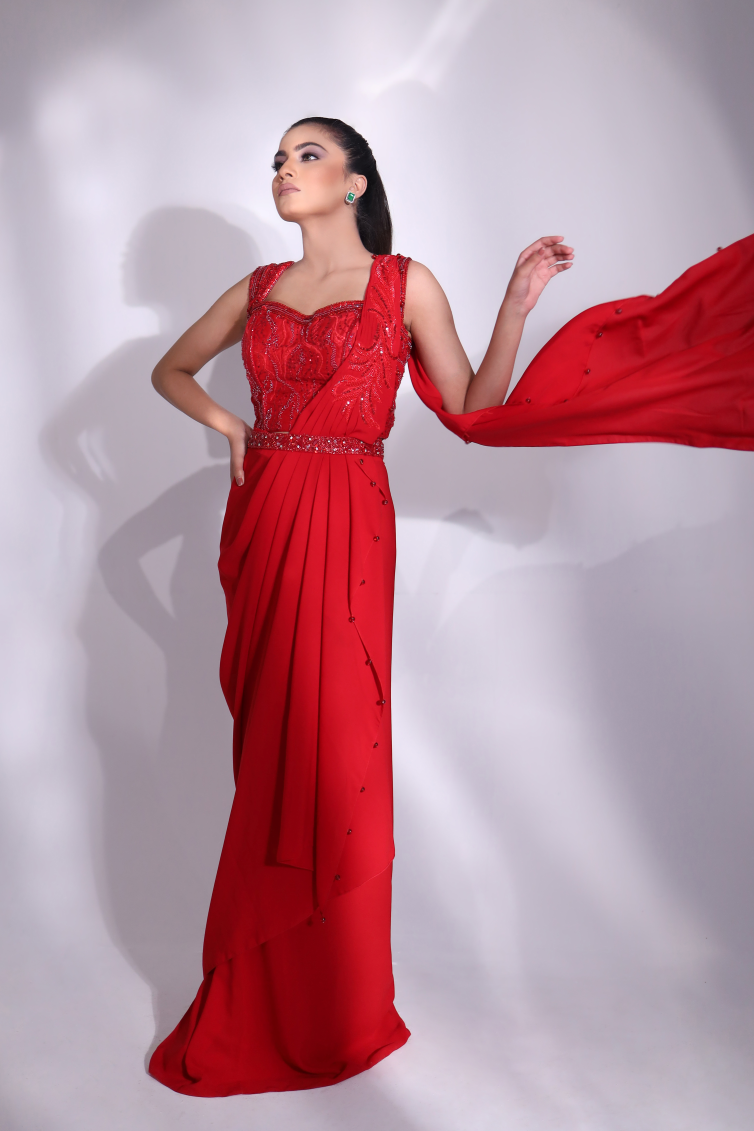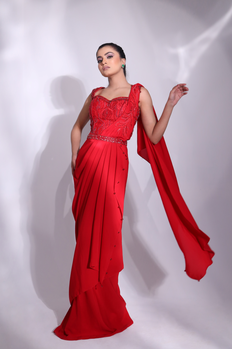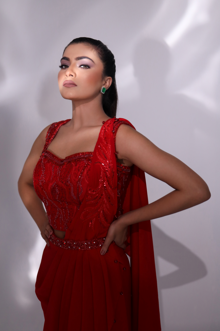 With A Corset Top And Wrap Saree, Teamed With Belt, Its A Captivating Choice For Any Occasion