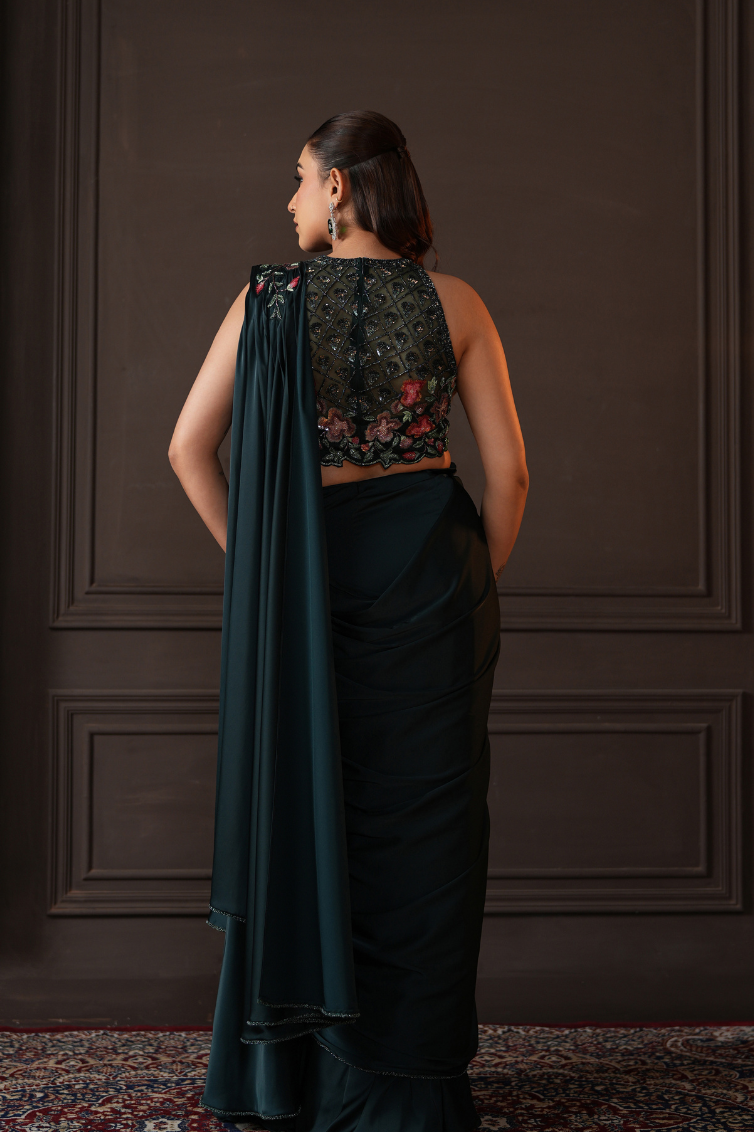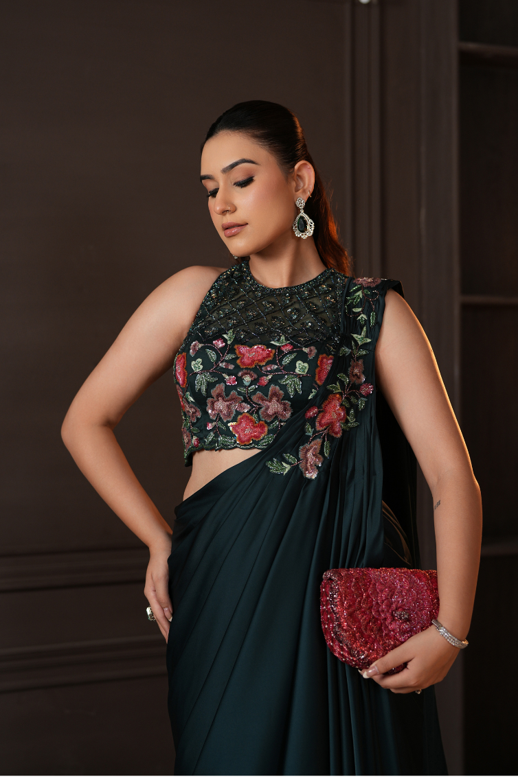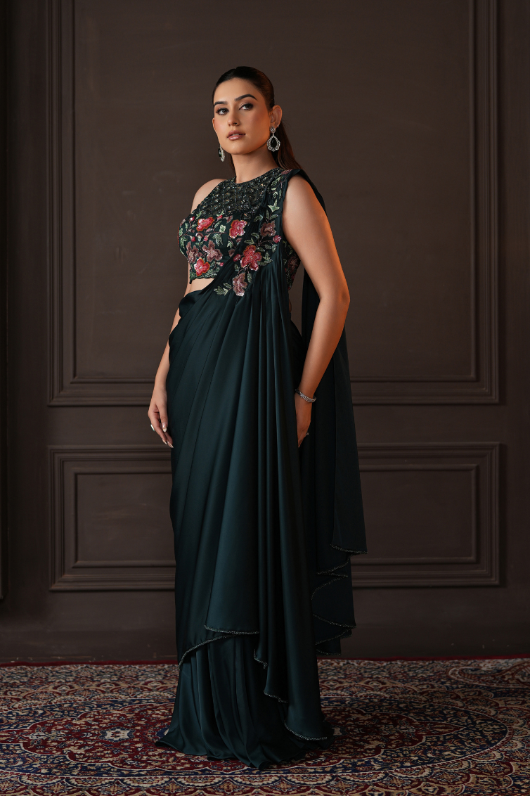 This draped Saree captures the magic of dusk. The rich satin fabric is a perfect backdrop for the hand embroidered shimmering, ornate blouse that’s accented in metallic and jewelled tones. It’s designed to make you feel radiant and glamorous, like a star under a new moon.