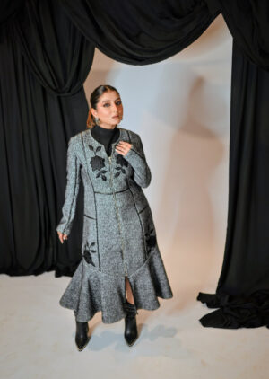 Detailed with Contrast black leather piping and velvet-touch floral embroidery, fit-and-flare silhouette adds to that perfect winter wardrobe charm.