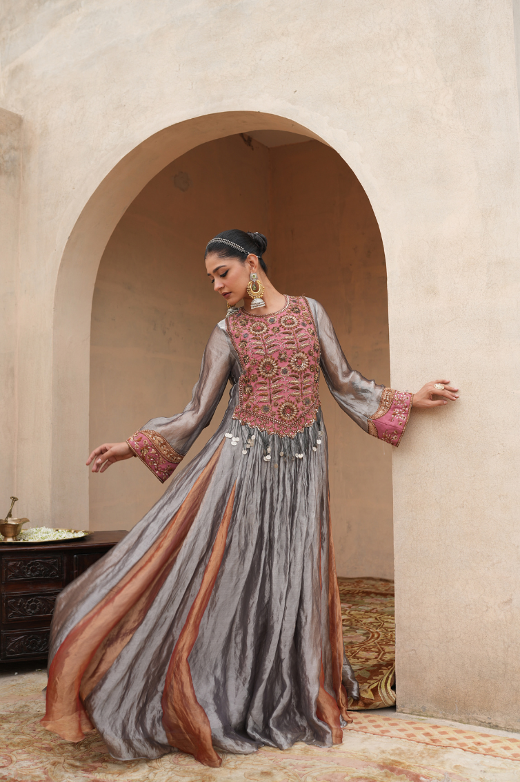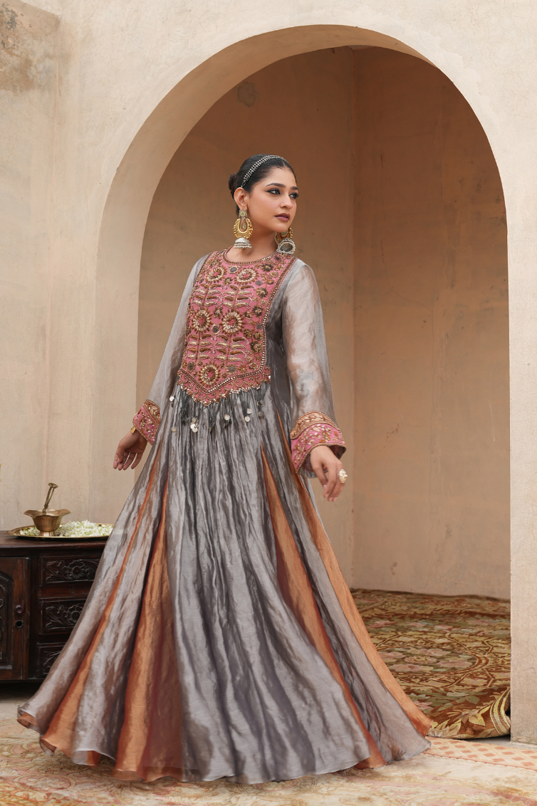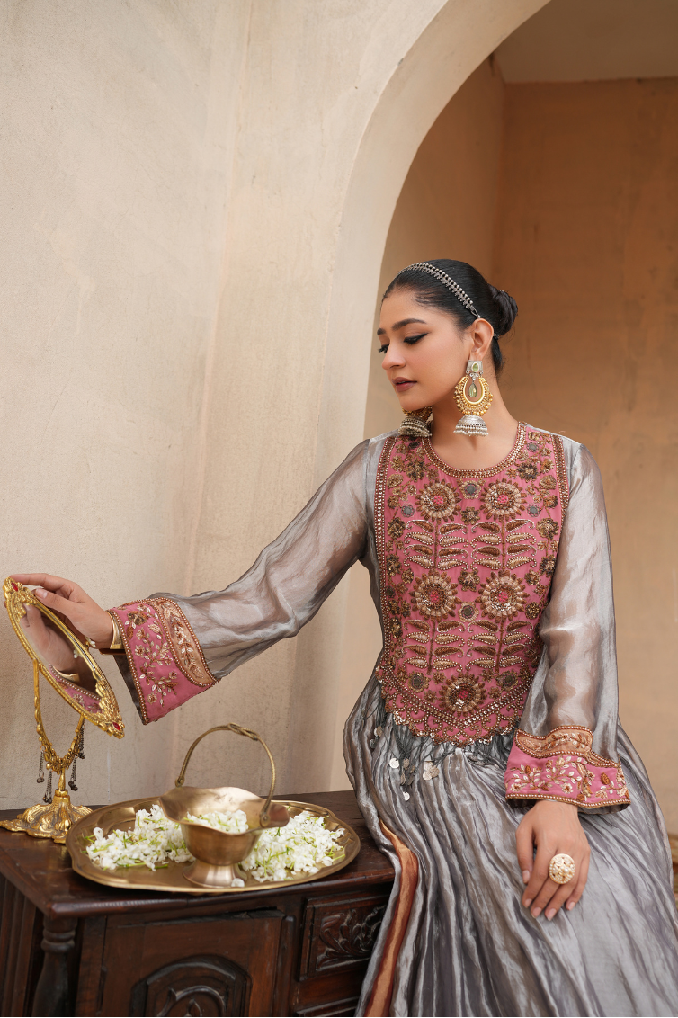 A true testament to timeless elegance and a masterpiece of vintage charm, this anarkali showcases intricate, hand-embroidered motifs in a soft, dusty rose and antique gold, on silk tissue fabrics. Delicate silver and golden colours cascade, catching the light with every move, adding depth and a sense of regal opulence.
