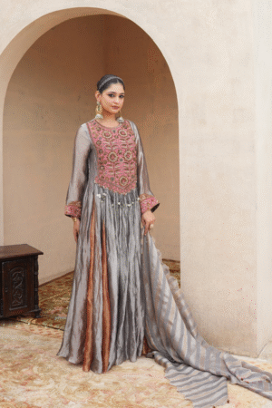 Designed for the woman who appreciates meticulous craftsmanship and unique style, the Zareen Anarkali is perfect for making a grand entrance. Paired with a gracefully striped dupatta, this ensemble is an ode to celebrations and new beginnings.
